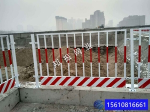 基坑護欄由防護網(wǎng)片和立柱組成?;訃鷵踝o欄防護網(wǎng)片由2cm×4cm方管焊接組成,單片尺寸1.1米×1.7米,兩端設有跨耳用Φ10螺栓與立柱連接固定,跨耳與上下邊緣距離為15cm。